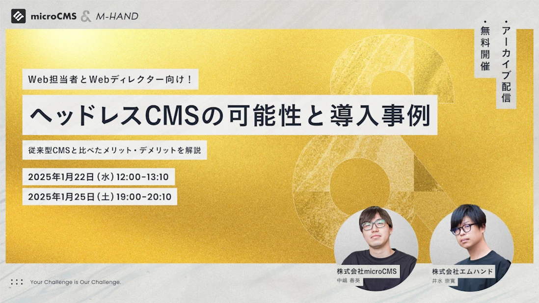 日本製のヘッドレスCMSとして最近話題の「microCMS」をご存知でしょうか? 今回は株式会社microCMSの中嶋様をお招きし、「microCMS」をもとにヘッドレスCMSについてご説明いただきます。また、実際に弊社が「microCMS」で制作した経験をもとにしたお話もご紹介いたしますので、是非ご参加ください。