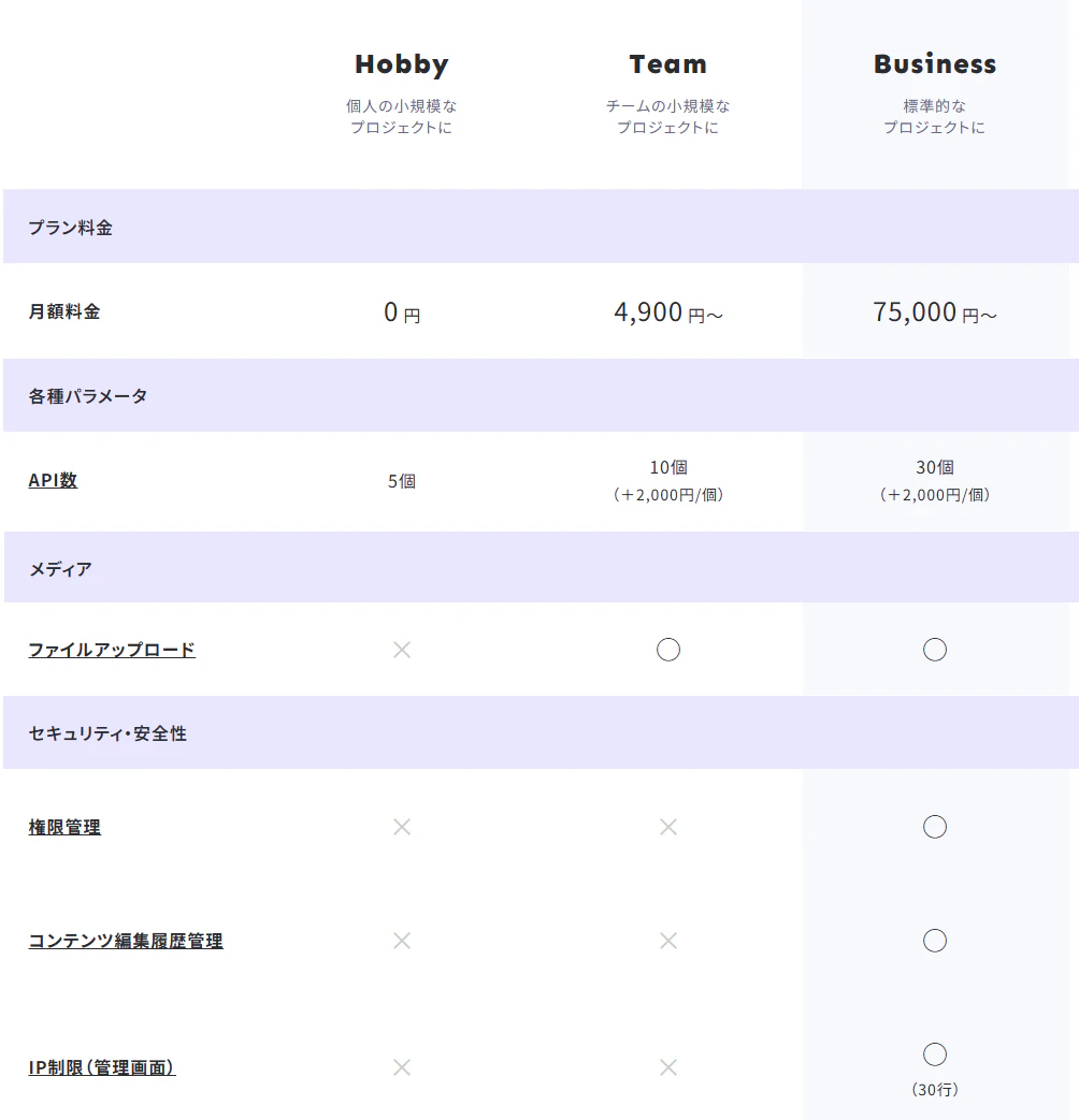 microCMSでは2025年6月10日より新料金プランを導入されます。エンタープライズプランを除く各プランの違いや、主な機能について分かりやすく解説します。特に、API数の考え方やメディアファイルのアップロード制限、権限管理について参考にしてください。