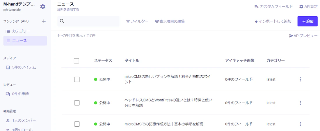 各種コンテンツをmicroCMSで作成・更新できます。各コンテンツにはカテゴリや分類分けがない場合、以下のような構成になります。
